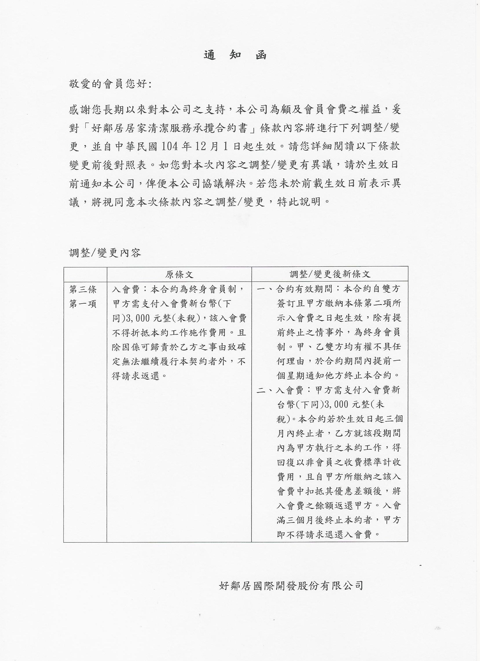「好鄰居居家清潔服務承攬合約書」條款內容將進行調整/變更,並自中華民國104年12月1日起生效。